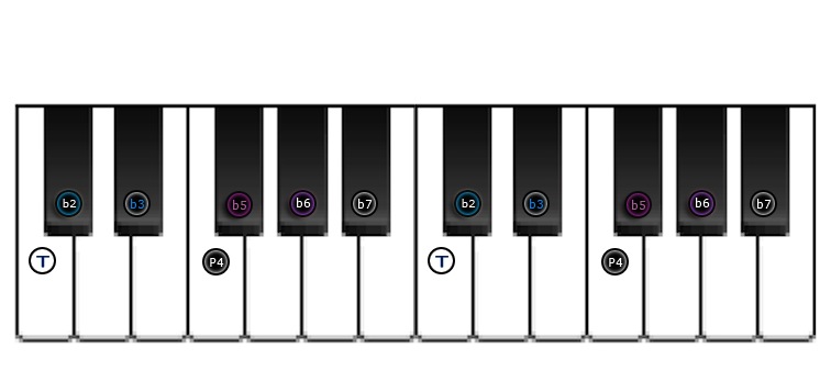 Le mode «Locrien»est un mode spécial, parce c'est le seul mode naturel à posséder une b5 (Quinte diminuée), et étant donner que ce n'est pas une note de la pentatonique mineure (il ne faut pas confondre la b5 en-tant que "blue note", avec la b5 du mode Locrien), si on joue la pentatonique mineure sur le Locrien on aura un chromatisme de la P4 à la b6, ce qui ne fera pas ressortir la couleur du Locrien, qui est le mode naturel le plus dur à exploiter.
